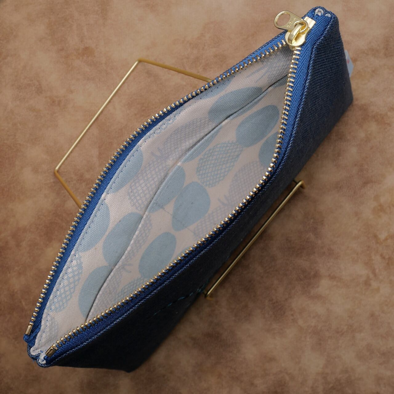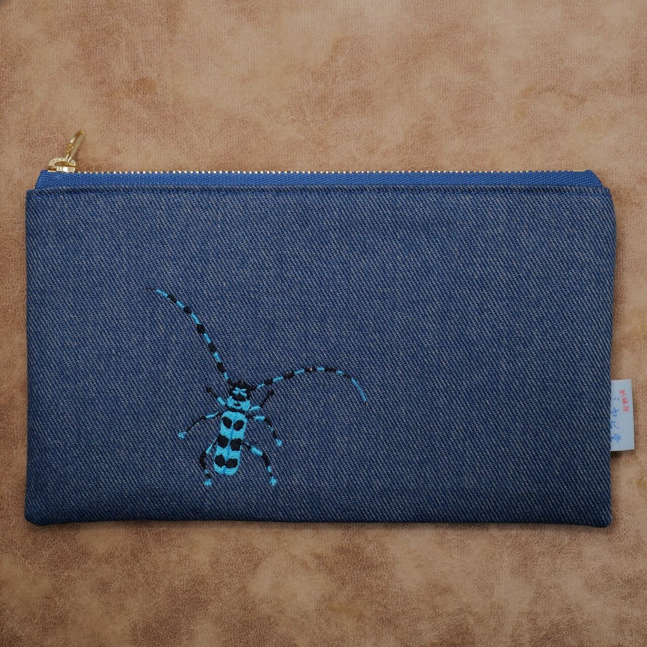 デニム地にルリボシカミキリの刺繍を施した薄型のシンプルなポーチです。